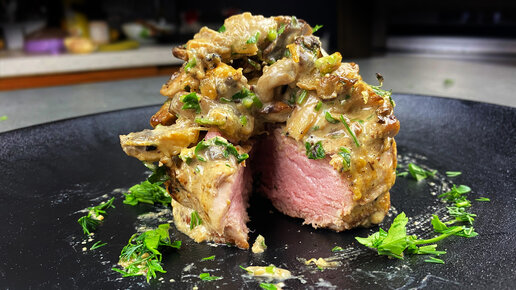 Название рецепта звучит как название ресторанного блюда, причем очень сложного. А на самом деле ничего сложного в нем нет. Разве что чистка и нарезка лука, честное слово! Потому дольше нахваливать не буду, а перейду сразу к делу: Берем: Как готовим: Вырезку нарезаем на медальоны толщиной 2-3 см. Обмываем, осушаем, солим, перчим и отправляем на сковороду с разогретым маслом. Обжариваем на сильном нагреве по 2-3 минуты с каждой стороны, до появления румяной корочки. Достаем мясо и на его место отправляем нарезанный четверть кольцами репчатый лук...
