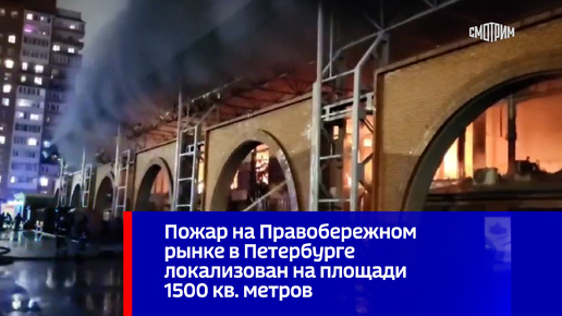 Площадь пожара в здании Правобережного рынка в Петербурге возросла до 300 кв м Площадь пожара в здании Правобережного рынка в Петербурге возросла до 300 квадратных метров, сообщает городское ГУМЧС. Ранее сообщалось, что здание рынка горит в Невском районе Петербурга на площади 50 квадратных метров. Сообщение о пожаре в здании на улице Дыбенко, 16 поступило в 17...