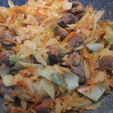 Тушёная капуста с мясом на сковороде. Простой домашний рецепт
