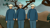 Давным-давно жили в Китае три брата Лю. Они были так похожи, что даже родная мать различала их только по цветным ленточкам. Один брат мог повелевать огнём, второй мог выпить море и вернуть его обратно, а третий знал язык птиц, зверей и рыб