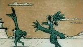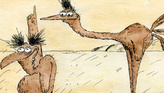 В почти голой, почти безжизненной пустыне гриф однажды встретил страуса и решил с ним поделиться той вкусной пищей, которую видел сверху, когда летел. Но гриф предлагает лететь, а страус не умеет. И одна птица берется научить вторую летать