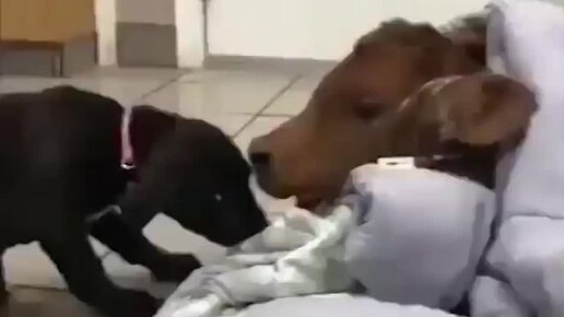 Собака вылизывает телёнка