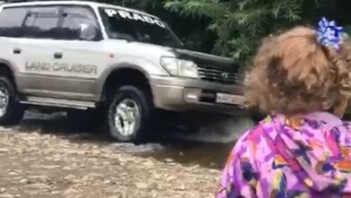 Водитель джипа катается по речке, в которой играют дети