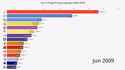 Инфографика языков программирования сентября 2004 по сентябрь 2019 года