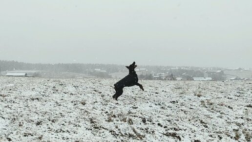 Доберман радуется первому снегу