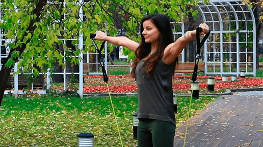 Тяга эспандера перед собой с разведением в стороны | Тренируем плечи с SUNMAG