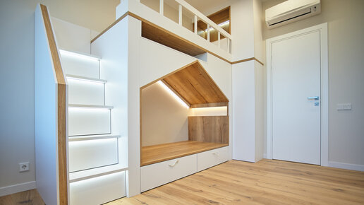 Детская комната от raumplus в скандинавском стиле, двухэтажная кроватка-домик, растущий шкаф-купе с дверью в ткани для проектора