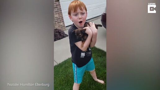 Мальчик плачет от счастья, когда ему подарили щенка бабушка и дедушка