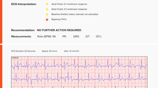 Всего за 30 секунд выявляются мерцательная аритмия, брадикардия, тахикардия или нормальный сердечный ритм.