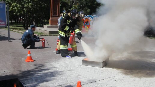 Девушка впервые в жизни пользуется огнетушителем