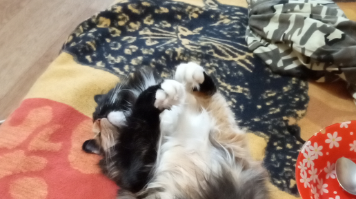 Как смешная трёхцветная кошка показывает свое доверие, показывая свой живот
