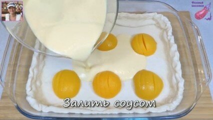 Нежный персиковый пирог Киш. Укладываю персики из банки на тесто и заливаю молочным соусом