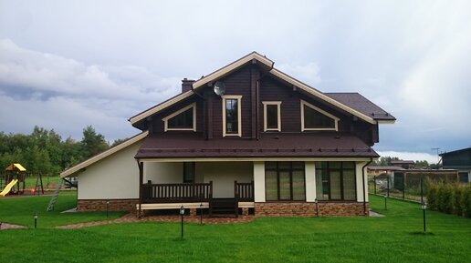 Видеообзор красивого двухэтажного комбинированного дома в стиле альпийского шале.