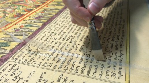 Процесс реставрация лубочного плаката "Как мыши кота хоронили"