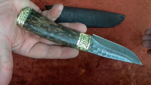 Нож Медведь (дамасская сталь, стабилизированная карельская береза, резной)