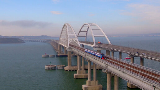 Как первый рельсобус по Крымскому мосту ехал: видеосъёмка с коптера