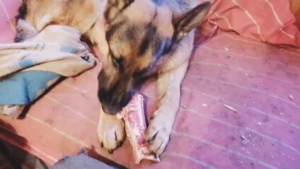 Немецкая овчарка грызет кость