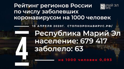 Рейтинг регионов России по числу заболевших коронавирусом на 1000 человек.