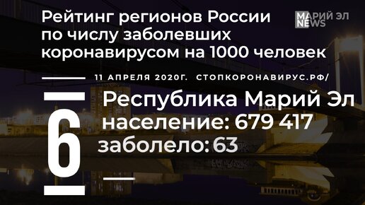 11 апреля 2020: Рейтинг регионов России по числу заболевших коронавирусом на 1000 человек.