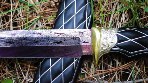 Нож "Ласка". Мозаичная дамасская сталь с никелем. Резная рукоять и ножны, инкрустированные серебром
