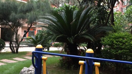 Внутренний дворик нашего дома в Китае: пруд с рыбками, турники, бассейн, зоны отдыха.