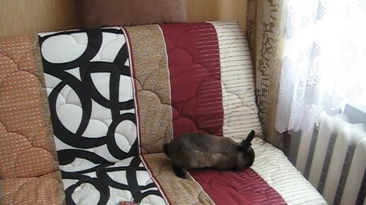 Декоративный кролик сердится и выражает свое негодование. Больше всего досталось дивану.