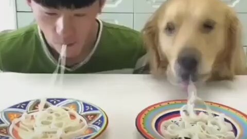 Кто быстрее съест макароны : человек 🧑🏻 или собака 🐶? Смешное видео 😂