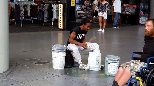 Барабанщик на вёдрах на улице Fremont Street Лас-Вегас