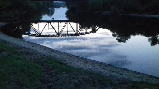 Железная массивная конструкция, окруженная зеленью и водой.