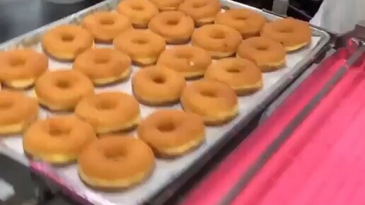 Как делают пончики на производстве. Розовая глазурь