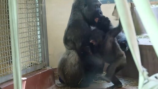 Горилла отец тренирует сына приемам борьбы