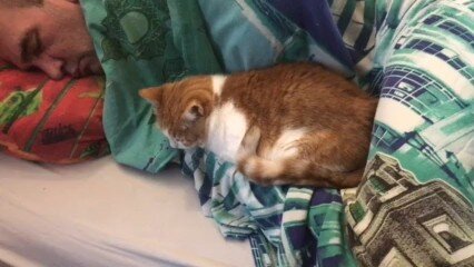 Посмотрите , как кошка стережёт сон своего любимого хозяина .