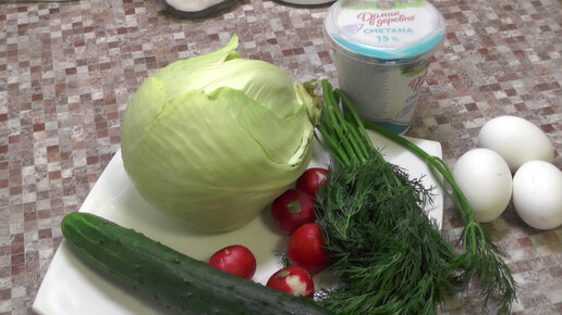 Легкий, но в то же время сытный салат из свежей капусты с огурцом и вареными яйцами