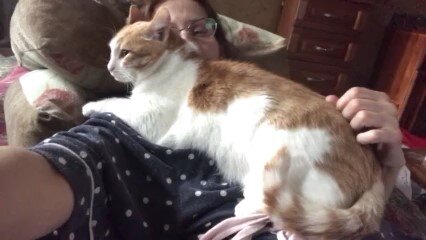 Я зацеловала свою кошку , послушайте , как громко мурлычет Рыся . Лежит она на мне .