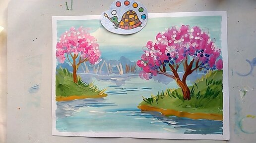 Цветущий май! Учимся рисовать весенний пейзаж, используя пальчиковую технику.