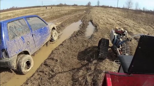 Гусеничный мотоблок против ОКА. Трактор вытягивает из грязи ОКА.
