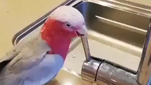 Попугай пользуется краном