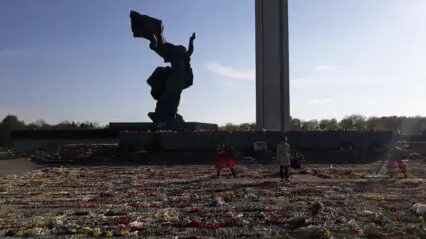 Памятник освободителям Риги. 10 мая 2020. Цветы и венки до ступенек.