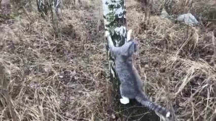 Кот Сенька пытается на толстое дерево залезть .
