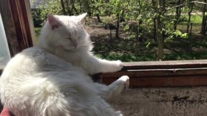 Кот Бела слушает птиц , а внизу бездомные котёнок с котом .