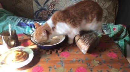 Как кошка Рыся тарелки за своим хозяином моет .