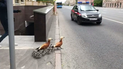 В Москве сотрудники Росгвардии помогли утиному выводку перейти оживленную дорогу