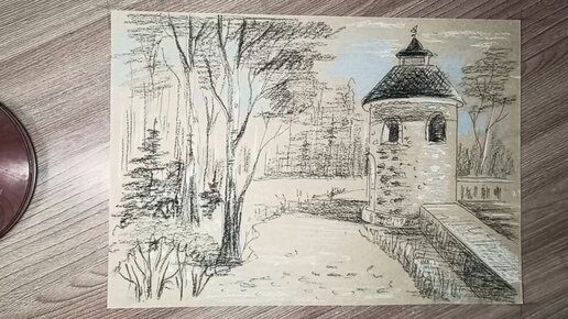 Пейзаж акварельными карандашами на крафтовой бумаге. Простой пошаговый видеоурок рисования для начинающих.