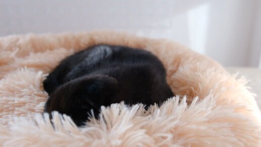 Котенок. Черный вислоухий котенок в пушистой лежанке