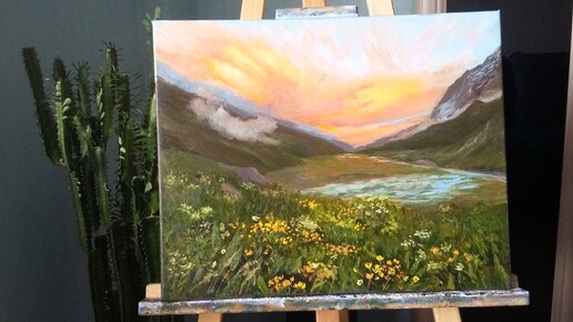 Рисуем дома картину маслом "ЗАКАТ В ГОРАХ"