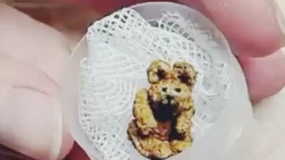Подвижный медведь связанный крючком высотой 1,5 см.