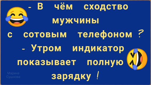В ЧЕМ СХОДСТВО МОБ ТЕЛЕФОНА И МУЖЧИН,А? ДА В ТОМ, ЧТО ОБА ПОКАЗЫВАЮТ ПО УТРАМ ПОЛНУЮ ЗАРЯДКУ )))
