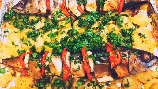 Скумбрия, запеченная в духовке с овощами. Получается невероятно вкусное и красивое блюдо!