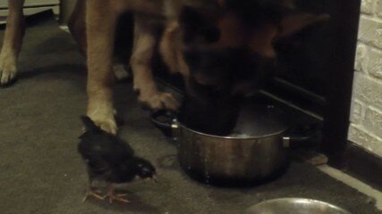 Овчарка и цыплёнок едят из одной миски. Забавный ролик.