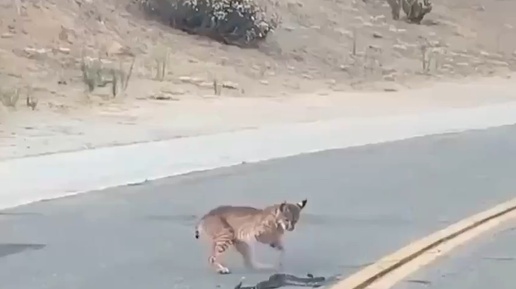 Молодая рысь играет с гремучей змеёй.